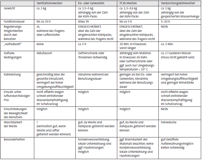 Gegenüberstellung verschiedener (leitungsunabhängiger) Kühlwestensysteme