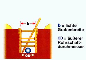 Besondere Maße gelten für Gräben mit senkrechten Wänden und mit Arbeitsraum. Das jeweils größere Maß aus den untenstehenden Tabellen ist zu nehmen.