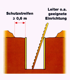 Zugänge in Baugruben und Gräben sind als Treppen vorzusehen. Bis 5 m Tiefe sind Leitern zulässig.