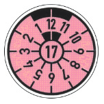 | 4. | Das Plakettenfeld muss in zwölf gleiche Teile (Zahlen 1 bis 12 entgegen dem Uhrzeigersinn dargestellt) geteilt sein. Der Abschnitt (60°) ist durch die Zahlen 11, 12 und 1 unterbrochen. Die oberste Zahl bezeichnet den Durchführungsmonat des Jahres, dessen letzten beiden Ziffern sich im Mittelkreis befinden. | ||||||||||||||||||||||||||