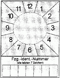 | 1.2.2.4 | Feld, "Fzg.-Ident.-Nummer" Anordnung: Kantenlänge (Höhe x Breite): Einzelfelder (Höhe x Breite): Strichstärke: Schrift: Schrifthöhe ("Fzg.-Ident.-Nummer"): Schrifthöhe ("die letzten 7 Zeichen"): |