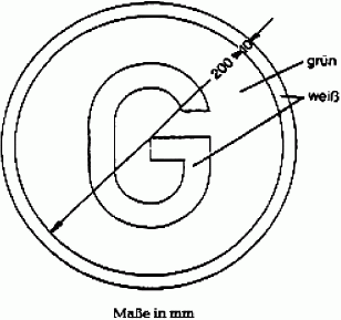 Buchstabe "G" hinsichtlich Schriftart und -größe gemäß DIN 1451, Teil 2, Ausgabe Februar 1986 (Bezugsquelle siehe § 73). Schriftgröße h = 125mm. Die Farbtöne sind dem Farbtonregister RAL 840 HR des RAL Deutsches Institut für Gütersicherung und Kennzeichnung e.V., Siegburger Straße 39, 53757 St. Augustin, zu entnehmen, und zwar ist als Farbton zu wählen für weiß: RAL 9001 und für grün: RAL 6001. Die Farben dürfen nicht retroreflektierend sein.