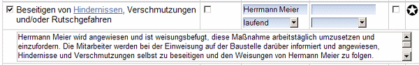 Um die Art der Maßnahme genauer zu beschreiben oder mitgeltende Dokumente (Arbeitsanweisungen, Betriebsanweisungen usw.) festzulegen, klicken Sie auf den Bemerkungs-Stern. Im Bemerkungsfeld können Sie die Regelungen präzisieren. Am Bildschirm sind max. 3 Zeilen gleichzeitig zu sehen, im Ausdruck alle.