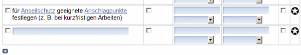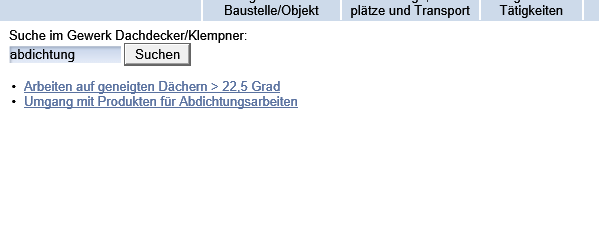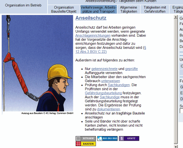 Während der Bearbeitung haben Sie jederzeit die Möglichkeit, sich über die vorhandenen Links weiter zu informieren. Wenn Sie im Beispiel oben in der Zeile über dem ersten Blanko-Feld auf den Link "Anseilschutz" klicken, erhalten Sie folgende weitere Informationen |