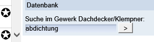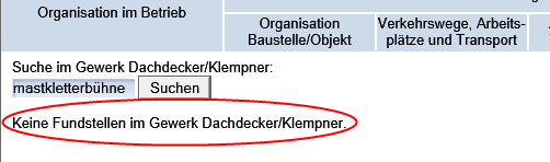 Wenn Sie nach der Bearbeitung feststellen, dass Sie in den Auswahlbögen der vorgegebenen Zusammenstellung einen Begriff nicht finden, prüfen Sie zunächst, ob der Begriff nicht doch in einem Auswahlbögen der Zusammenstellung für das gesamte Gewerk enthalten ist. Hierzu dient die Suchfunktion am unteren Ende der rechten Bildschirmspalte. Geben Sie im Feld „Suche im Gewerk xxx“ den Suchbegriff ein. Probieren Sie auch ähnlich Begriffe.