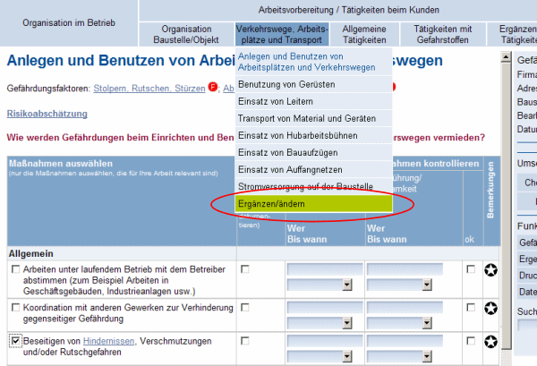 Klicken Sie auf die grün unterlegte Zeile „Ergänzen/ändern“. Sie kommen zur Seite „Gefährdungsbeurteilung ergänzen/ändern“, mit der Sie die Gefährdungsbeurteilung an Ihre betrieblichen Gegebenheiten anpassen können.