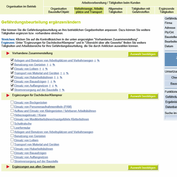Sie erhalten in einem Pulldown-Menü eine Zusammenstellung von Auswahlbögen zu Tätigkeiten und Arbeitsbereichen, die für Ihr Gewerk in der Regel wichtig sind. Arbeiten Sie zunächst die Auswahlbögen ab, die für Sie schon zutreffen oder zukünftig relevant sein können. (Sollten für Ihren Betrieb Tätigkeiten oder Arbeitsbereiche fehlen, können Sie ergänzend Auswahlbögen hinzuladen oder ändern: siehe hierzu Kap. 4 „Ergänzen/ändern: Anpassen der Zusammenstellung“)