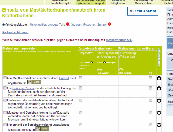 In den Ergänzungen für das gerade aktivierte Gewerk, hier Hochbau, werden weitere Auswahlbögen, die im Rahmen einer detaillierteren Gefährdungsbeurteilung wichtig sind, vorgeschlagen. Sie finden zum Beispiel den Auswahlbogen „Einsatz von Mastkletterbühnen/mastgeführte Kletterbühnen“. Ob der Inhalt für Sie relevant ist, können Sie durch Klicken auf den Text testen und Sie erhalten zur Information:
