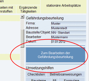 Geben Sie die Grunddaten Ihrer Gefährdungsbeurteilung wie Firma, Arbeitsbereich, Verantwortlicher usw. auf der Titelseite rechts neben dem Bild ein. Sie können die Daten auch jederzeit später noch eingeben oder ändern.