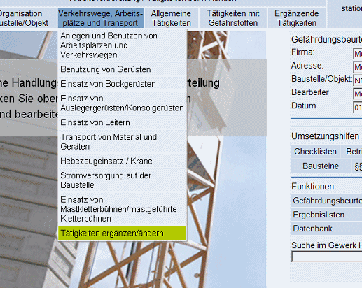 Wählen Sie oben im Menü unter dem Eintrag "Arbeitsvorbereitung / Tätigkeiten beim Kunden" das Feld „Verkehrswege, Arbeitsplätze und Transport“.