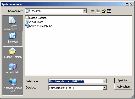 Wenn Sie so alle Tätigkeiten und Arbeitsbereiche beurteilt und die Maßnahmen festgelegt haben, speichern Sie Ihre Gefährdungsbeurteilung ab. Dazu klicken Sie rechts unter "Funktionen" "Gefährdungsbeurteilung" im Menü auf "Speichern unter" und geben Ihrer Gefährdungsbeurteilung einen Dateinamen. Vorgeschlagen wird Ihnen ein Dateinamen, der sich zusammensetzt aus dem Namen des ausgewählten Gewerks sowie, wenn von Ihnen eingegeben, der Baustelle/des Objekt und dem Datum. Sie können diesen Dateinamen natürlich ändern. Die Speicherdatei können Sie auf Ihrem Rechner nach Ihrer Systematik ablegen.