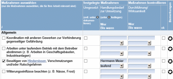 Auf diese Weise legen Sie im Auswahlbogen alle weiteren nach Gefährdungsbeurteilung notwendigen Maßnahmen fest. Das sind in der Regel sehr viel weniger als die Ihnen angebotenen Maßnahmen.