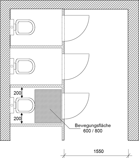 In bestehenden Toilettenzellen mit Türanschlag nach außen ist bis zu einem wesentlichen Umbau eine Reduzierung der Tiefe der Bewegungsfläche (600 mm) um 50 mm zulässig. In bestehenden Toilettenzellen mit Türanschlag nach innen ist bis zu einem wesentlichen Umbau eine Reduzierung des Abstandes Vorderkante Toilette bis Schwenkradius der Toilettentür um 100 mm zulässig.