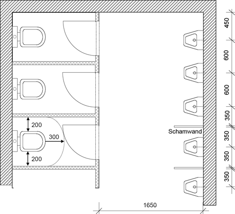 Abb. 3.1: Einbündige Toilettenanlage mit Urinalen, Türanschlag nach außen (Maße in mm)