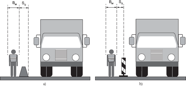 (2) Seitliche Sicherheitsabstände (SQ) werden bei Fahrzeug-Rückhaltesystemen auf die dem Verkehr zugewandte äußere Begrenzung des Fahrzeug-Rückhaltesystems bezogen (siehe Abbildung 1a)). Seitliche Sicherheitsabstände (SQ) werden bei Leitbaken, Leitkegeln, Leitwänden, Leitschwellen und Leitborden jeweils auf deren Mittelachse bezogen (siehe Abbildung 1b)). Aufgrund ihrer unterschiedlichen Abmessungen werden diesen Elementen spezifische Sicherheitsabstände zugeordnet.
