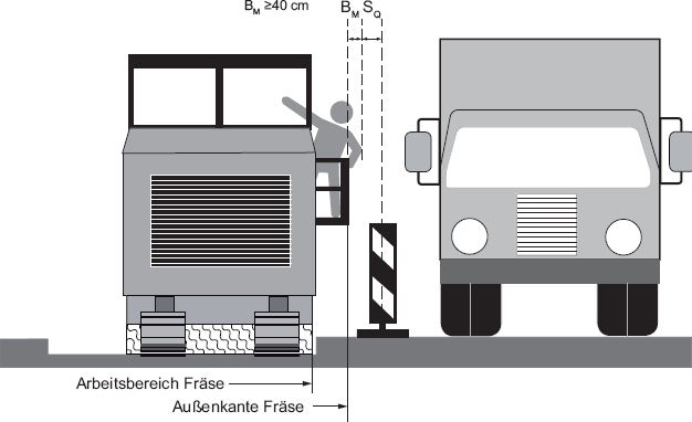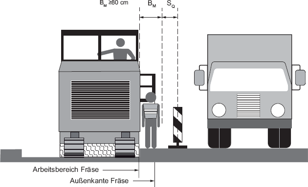 Abb. 2a: Seitlicher Sicherheitsabstand (SQ) und Mindestbreite (BM) für Arbeitsplätze und Verkehrswege auf Straßenbaustellen, Beispiel Fräse mit herauslehnendem Fahrer