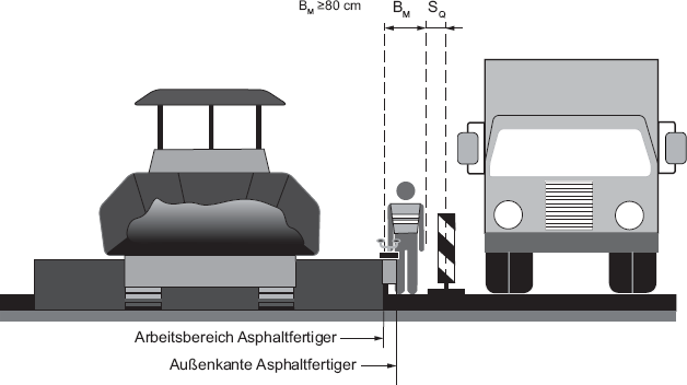 Abb. 3: Seitlicher Sicherheitsabstand (SQ) und Mindestbreite (BM) für Arbeitsplätze und Verkehrswege auf Straßenbaustellen, Beispiel Asphaltfertiger