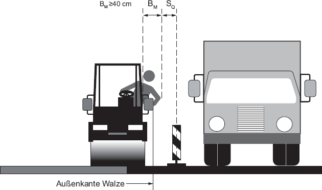 Abb. 4: Seitlicher Sicherheitsabstand (SQ) und Mindestbreite (BM) für Arbeitsplätze und Verkehrswege auf Straßenbaustellen, Beispiel Walze mit Überlappung im Bereich der Naht