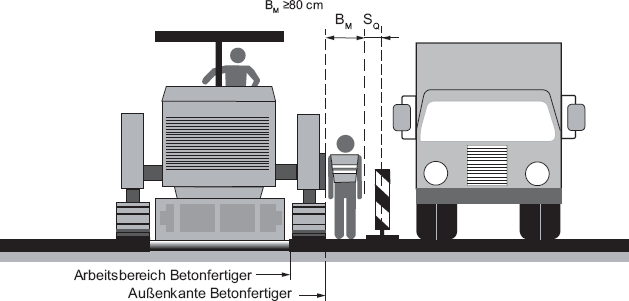 Abb. 5: Seitlicher Sicherheitsabstand (SQ) und Mindestbreite (BM) für Arbeitsplätze und Verkehrswege auf Straßenbaustellen, Beispiel Beton-/Gussasphaltfertiger mit überkragendem Kettenlaufwerk