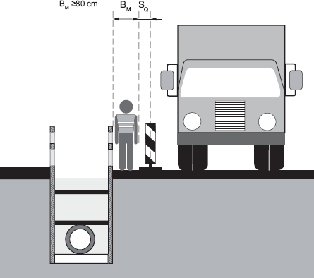 Abb. 6: Seitlicher Sicherheitsabstand (SQ) und Mindestbreite (BM) für Arbeitsplätze und Verkehrswege auf Straßenbaustellen, Beispiel Kanalgrabenherstellung