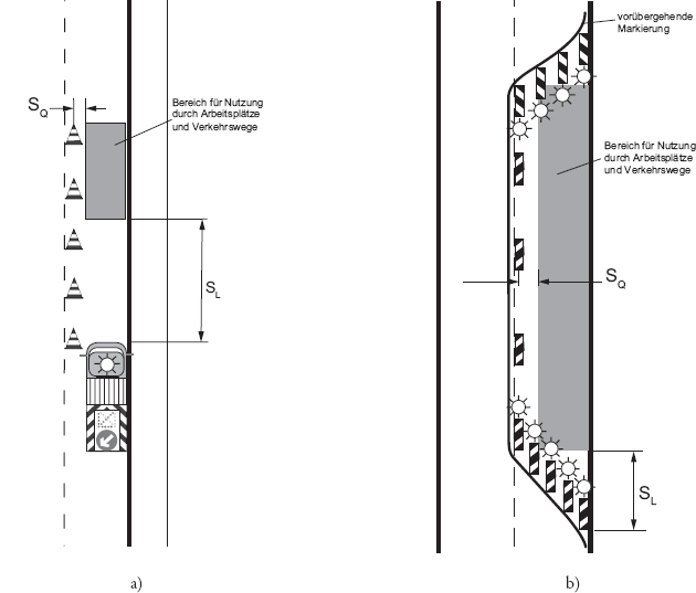 (1) Für Arbeitsplätze und Verkehrswege auf Straßenbaustellen ist ein Sicherheitsabstand in Längsrichtung (SL) zum ankommenden Verkehr vorzusehen. Damit wird z. B. die Gefährdung durch unbeabsichtigtes Hineinfahren in den abgesperrten Bereich der Baustelle berücksichtigt. In diesem Sicherheitsabstand (SL) dürfen sich außer zum Auf- und Abbau der Verkehrseinrichtungen keine Arbeitsplätze oder Verkehrswege befinden.