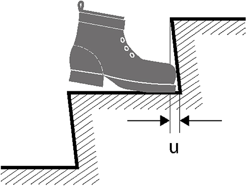 (23) Für Beschäftigte mit Gehbehinderung, z. B. mit einer Fußhebeschwäche, müssen Treppen geschlossene Stufen haben. Unterschneidungen sind grundsätzlich nicht zulässig. Abweichend davon ist bei geschlossenen Stufen mit schrägen Setzstufen eine Unterschneidung (u) von maximal 2 cm zulässig (siehe Abb. 1). Ausgenommen sind Treppen, die ausschließlich als Fluchtweg in Abwärtsrichtung genutzt werden. (abweichend von ASR A1.8 Abb. 4)