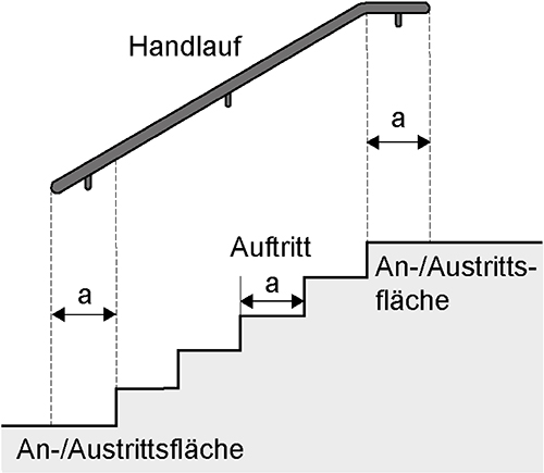 (25) Für blinde Beschäftigte und Beschäftigte mit Sehbehinderung müssen die Enden der wandseitigen Handläufe am Anfang und Ende von Treppen um das Maß des Auftritts an der An- bzw. Austrittsfläche fortgeführt werden (Abb. 2). Am Treppenauge darf der Handlauf nicht um das Maß des Auftritts fortgeführt werden. Die Enden der Handläufe sollen abgerundet sein und nach unten oder zur Wandseite auslaufen. Halterungen für Handläufe sollen an der Unterseite angeordnet sein.