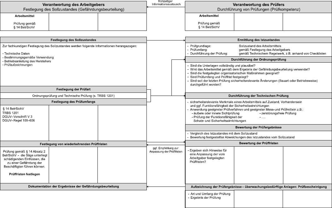Der Arbeitgeber muss dem Prüfer die für die Durchführung der Prüfung notwendigen Informationen und insbesondere die festgelegte Prüffrist zur Verfügung stellen. Die Festlegung des Sollzustandes der Tischkreissäge ergibt sich z. B. aus den folgenden Unterlagen: