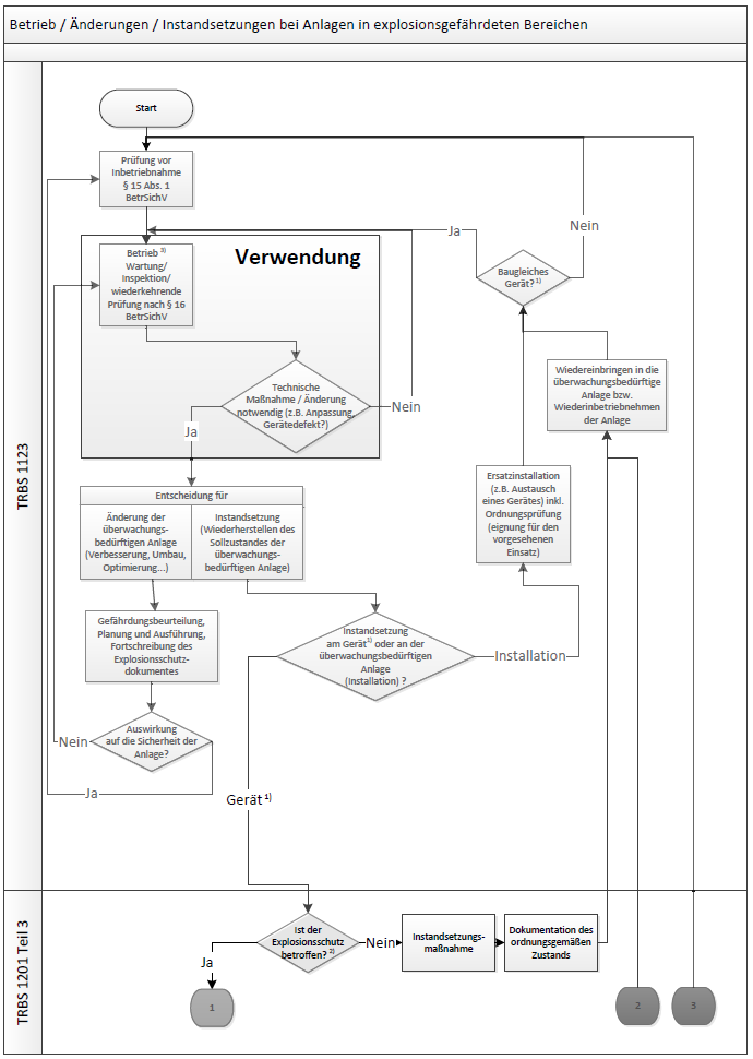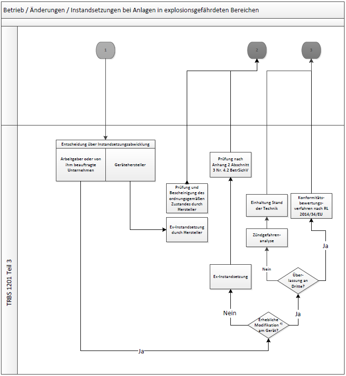 Auf Blatt 1 befinden sich im Wesentlichen Vorgänge, die in Verantwortung des Arbeitgebers der überwachungsbedürftigen Anlage ausgeführt werden. Aus dem Betrieb (inkl. Wartung, Inspektion, wiederkehrende Prüfungen) heraus kann sich die Notwendigkeit einer technischen Maßnahme ergeben. Abhängig von den vorliegenden Randbedingungen wird sich der Arbeitgeber für eine Änderung seiner Anlage oder für eine Instandsetzungsmaßnahme entscheiden. Bei einer Instandsetzung ist wiederum zu unterscheiden zwischen einer Maßnahme an der Installation (z. B. Austausch eines defekten Gerätes gegen ein Ersatzgerät) oder einem Eingriff in ein Gerät, ein Schutzsystem oder eine Sicherheits-, Kontroll- und Regelvorrichtung im Sinne der Richtlinie 2014/34/EU. Wenn im letztgenannten Fall darüber hinaus festgestellt wird, dass die erforderliche Instandsetzungsmaßnahme relevant für den Explosionsschutz ist (siehe Abschnitte 3 und 4 dieser TRBS), greift § 15 BetrSichV in Verbindung mit Anhang 2 Abschnitt 3 Nummer 4.2 BetrSichV, und im Ablaufschema erfolgt am Übergabepunkt "1" der Übergang auf Blatt 2.