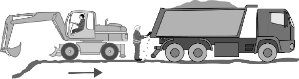 Im Rahmen einer Baumaßnahme wird am rechten Straßenrand ein Graben ausgehoben. Der Aushub wird in stetem Wechsel mit Kippsattel-Zügen abtransportiert. Aufgrund der örtlichen Verhältnisse können die Sattelzüge während der Beladung nicht neben dem Bagger stehen. Daraus ergibt sich, dass der Bagger vor Kopf den Graben aushebt und den im Heck stehenden Kippsattel belädt. Hierbei schwenkt der Bagger bei jedem Ladezyklus um 180 ° nach rechts. Nach Abschluss der Beladung kontrolliert der Lkw-Fahrer das Fahrzeug und reinigt erforderlichenfalls die Heckpartie des Lkw. Dabei betritt er ggf. den Gefahrenbereich zwischen Bagger und Lkw.