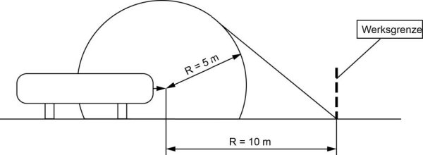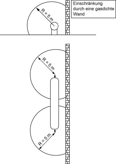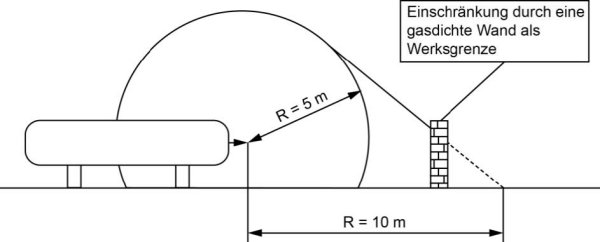 Geometrische Darstellung der Bereiche mit möglicher Gefährdung durch akut toxische Gase der Kat. 1 bis 3