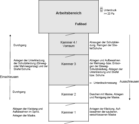 Als Vorraum oder Kammer 4 kann zur Vorreinigung auch eine Luftdusche eingesetzt werden. Luftduschen dürfen an Stelle von Nassduschen nur eingesetzt werden, wenn sie behördlich oder berufsgenossenschaftlich zugelassen sind.