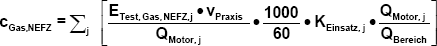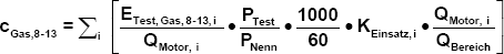 Aus den Emissionswerten der Typprüfung (in g/kWh beim 8- und 13-Stufentest bzw. in g/km beim Rollentest) und den motorspezifischen Wettermengen kann die Konzentration der einzelnen Abgaskomponenten in der Luft am Arbeitsplatz für einen Abbaubereich mit mehreren dieselgetriebenen Fahrzeugen nach den folgenden Formeln berechnet werden: