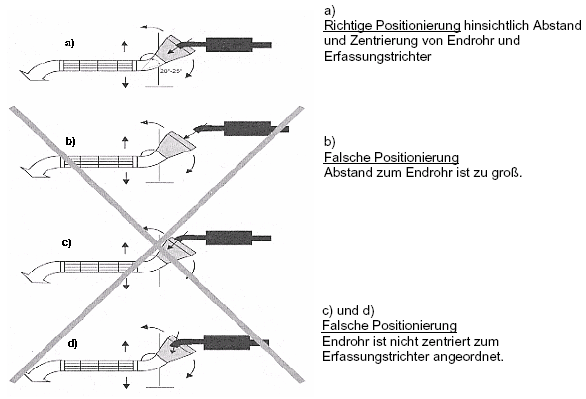 (1) Die Abgase der Dieselmotoren sind bei AU vollständig am Auspuff zu erfassen und aus dem Arbeitsbereich zu entfernen. Das Erfassungselement muss der Auspuffanlage angemessen sein. Der Erfassungstrichter ist so zum Endrohr des Auspuffs anzuordnen, dass die Abgase möglichst geradlinig in die Ansaugöffnung hineinströmen. Das Endrohr ist zentriert im Erfassungstrichter anzuordnen, wobei es möglichst weit in diesen eintauchen sollte. Um den Fremdluftanteil gering zu halten,sollte der Öffnungswinkel des Trichters 20° bis 25 ° betragen. Auf die im Bild 1 dargestellten Positionierungsbeispiele wird verwiesen.