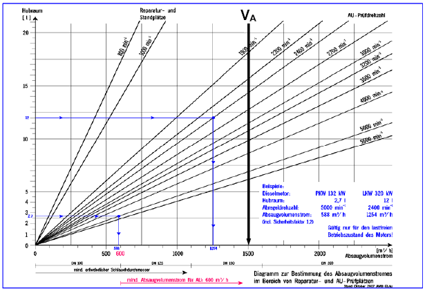 Der erforderliche Absaugvolumenstrom kann auch, abhängig von Hubraum und Abregeldrehzahl des Motors, dem Diagramm (Anlage) entnommen werden. Mindestens ist aber ein Abgasabsaugvolumenstrom VA von 600 m3/h für Pkw und Transporter und von 1200 m³/h für Lkw zu gewährleisten.