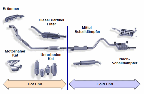 (2) Je nach Fahrzeugtype sowie Betriebsweise, Motorart, Motormanagement, geometrischer Anordnung aller Komponenten der Abgasanlage vom Motorraum bis hin zum Abgasendrohr, thermischer, mechanischer und chemischer Randbedingungen kommen unterschiedlichste Abgassysteme zum Einsatz. In den folgenden Ausführungen werden nur auf dem Markt verfügbare Systeme und Werkstoffe betrachtet.