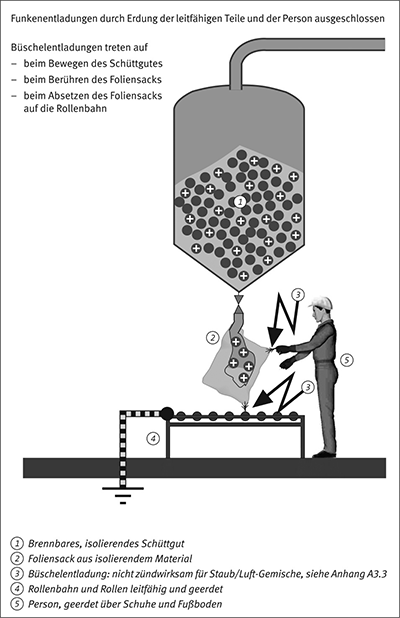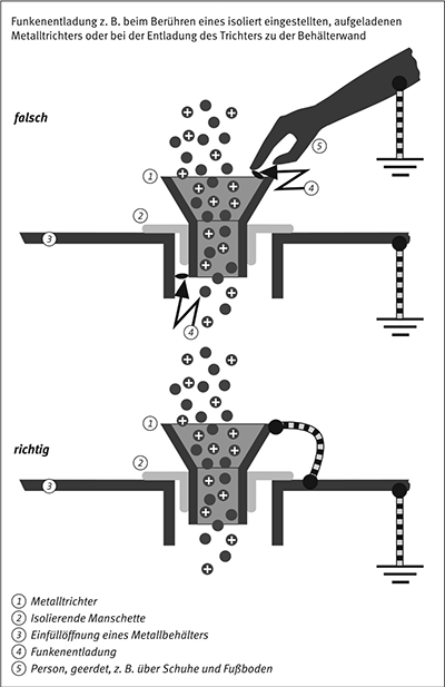 (2) Schüttgüter und Schüttgutbehälter sind so zu handhaben bzw. zu betreiben, dass gefährliche Aufladungen vermieden werden. Gefährliche Aufladungen können sowohl auf dem Schüttgut als auch auf dem Schüttgutbehälter angesammelt werden.