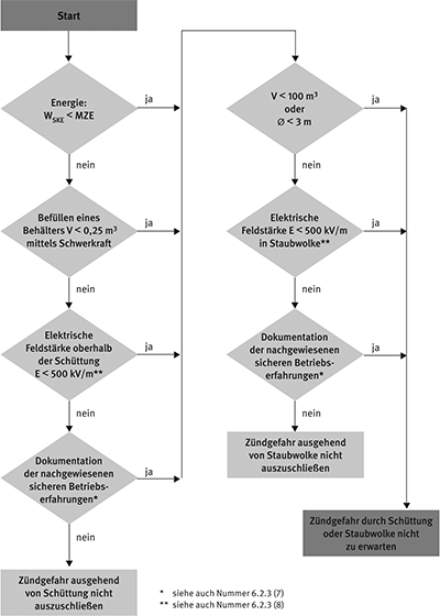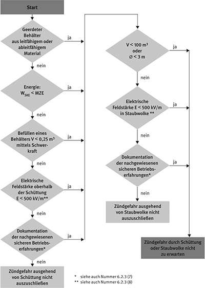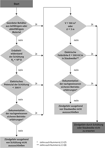 (1) Anhand der Ablaufdiagramme 1 bis 3 auf den folgenden Seiten kann geprüft werden, ob das Schüttgut beim Befüllen von Behältern gefährlich aufgeladen werden kann. Gegebenenfalls sind Maßnahmen gegen Schüttkegelentladungen (SKE), gewitterblitzartige Entladungen oder Funkenentladungen zu treffen.