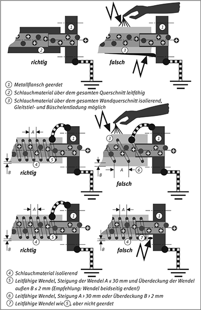 (2) Um Funkenentladungen und auch Korona- und Büschelentladungen an Rohren und Schläuchen aus leitfähigem Material zu vermeiden, sind sie wenigstens an einem Ende zu erden und die Länge ist zu begrenzen.