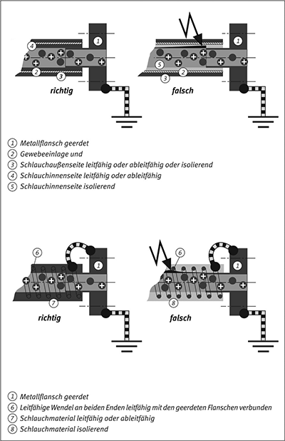 (2) Unabhängig von der Wahl des Schlauchmaterials sind alle leitfähigen Teile des Schlauches, z. B. Stützwendeln, Armaturen zu erden.