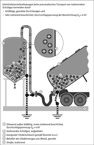 Der pneumatische Transport von Schüttgütern oder das Abwerfen von Schüttgut über Rohrleitungen, Schüttrinnen, etc. mit einer Fallhöhe von mehr als 3 m stellt einen stark ladungserzeugenden Prozess dar, welcher die Innenwand von isolierenden Rohrleitungen, Schüttrinnen, etc. gefährlich aufladen kann. Wird aufgeladenes Schüttgut in einen isolierenden Behälter, dessen Volumen 0,25 m3 überschreitet, eingefüllt, kann eine gefährliche Aufladung auftreten, siehe dazu auch Nummern 6.2.3.2 und 6.2.3.3.