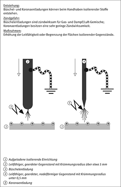 In Behältern sind Büschelentladungen zwischen Einbauten und der Oberfläche isolierender Flüssigkeiten nicht zu erwarten, wenn das Potential an der Oberfläche der Flüssigkeit 25 kV nicht überschreitet. Für Gefahrstoffe der Explosionsgruppe IIA werden die auftretenden Entladungen erst ab einem Oberflächenpotential von etwa 58 kV zündwirksam.