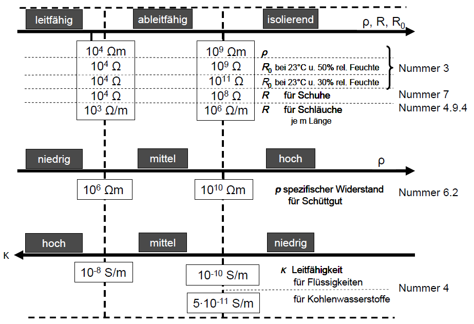 Die Einteilung, die den entsprechenden Abschnitten der Regel jeweils für die Bereiche „leitfähig“, „ableitfähig“ und „isolierend“ zu Grunde liegt, ist in der folgenden Übersicht zusammengestellt: