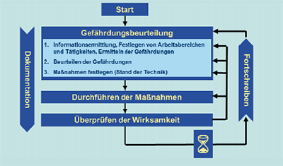 (2) Folgende Prozessschritte sind bei der Gefährdungsbeurteilung, der Durchführung von Schutzmaßnahmen und deren Wirksamkeitsprüfung zu berücksichtigen: