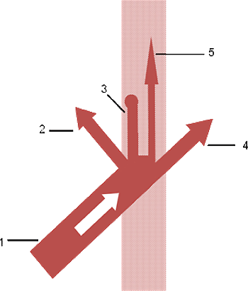 1 auffallender Schall 2 reflektierter Schall 3 in Wärme umgewandelter Schall (Luft- und Körperschallabsorption) 4 durchtretende Schallenergie 5 Körperschallfortleitung |
