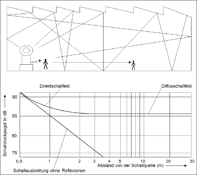 Abb. 2 Einteilung des Schallfeldes in Direktschallfeld und Diffusschallfeld bei halligem Raum