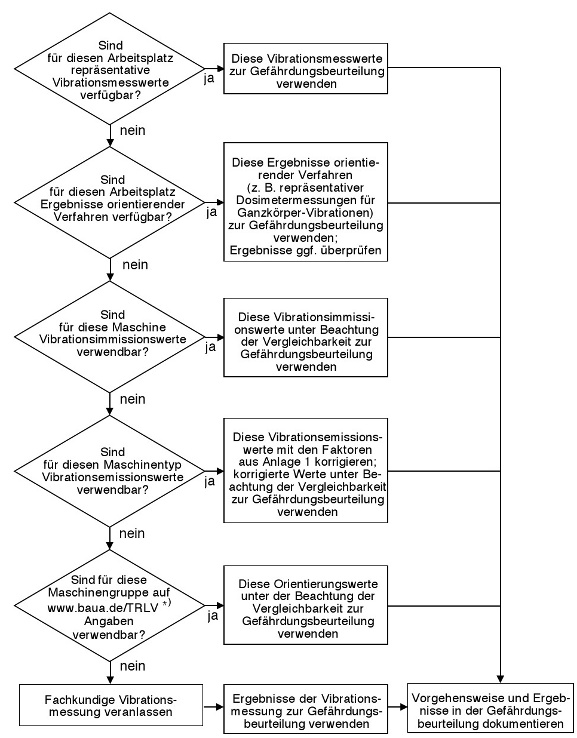(2) Derartige Werte sind auch aus Internet-Datenbanken mit Vibrationsmessergebnissen aus der Praxis und vergleichbaren, oft branchenspezifischen Publikationen der Arbeitgebervereinigungen, der Unfallversicherungsträger, der Arbeitsschutzbehörden oder anderer Institutionen zu entnehmen. Beispiele von Immissionswerten für Maschinentypen unter bestimmten Betriebsbedingungen sind auf der jährlich aktualisierten Internetseite der Bundesanstalt für Arbeitsschutz und Arbeitsmedizin (BAuA) http://www.baua.de/TRLV vorhanden. Ausschlaggebend für die Verwendung der Werte ist, ob die angegebenen Einsatz- und Betriebsbedingungen mit den Verhältnissen vor Ort vergleichbar sind.