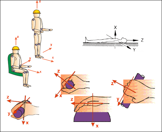 Abb. 1 Koordinatensystem für Ganzkörper-Vibrationen und Hand-Arm-Vibrationen