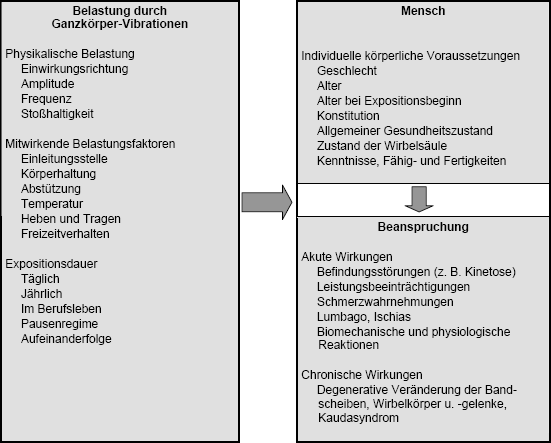 (1) Bei der Einwirkung von Ganzkörper-Vibrationen können interindividuell große biologische Variationen vorkommen. Ganzkörper-Vibrationen können das allgemeine Wohlbefinden stören, die menschliche Leistungsfähigkeit beeinflussen oder ein Gesundheits- und Sicherheitsrisiko (s. Abbildung 2) darstellen. Niederfrequente Vibrationen mit Frequenzen unter 0,5 Hz können die Funktion des Gleichgewichtsorgans stören und zu Kinetosen (Bewegungskrankheit, Seekrankheit) führen. Weitere akute Wirkungen von Ganzkörper-Vibrationen können schmerzhafte Muskelverspannungen, Verdauungsstörungen, Störungen der peripheren Durchblutung oder Funktionsstörungen der weiblichen Fortpflanzungsorgane sein. Ausgelöst durch Vibrationen kann es zur Änderung physiologischer/biochemischer Parameter (z. B. der Pulsfrequenz, des Blutdrucks oder der Ausschüttung von Hormonen) kommen, die von den Beschäftigten individuell sehr verschieden als Unbehagen bis hin zu Schmerzen wahrgenommen werden und zur Beeinträchtigung der Leistungsfähigkeit führen können.
