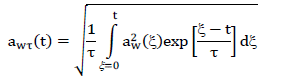 Der gleitende Effektivwert awt(t) der frequenzbewerteten Schwingbeschleunigung aw(t) ist zeitlich veränderlich und wird nach folgender Gleichung ermittelt: